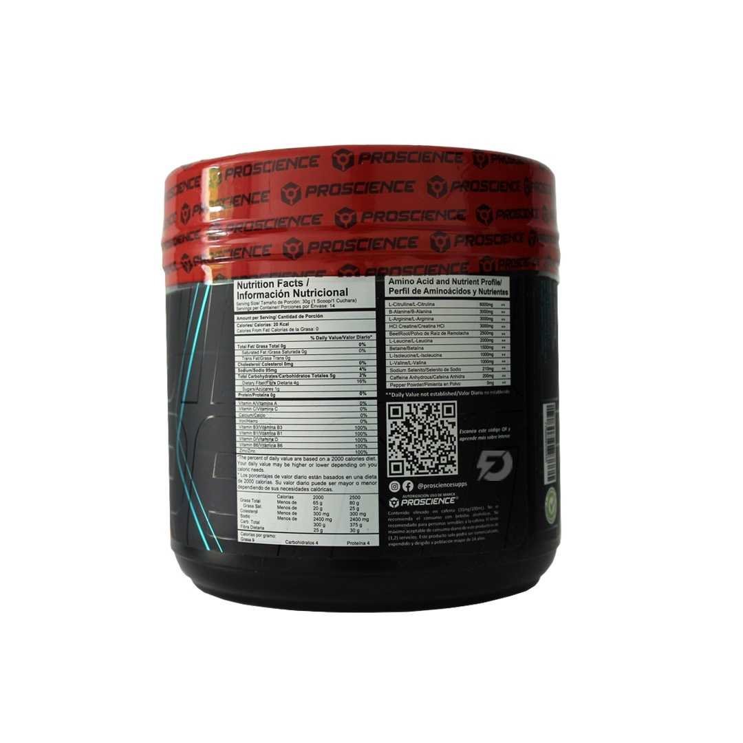 Ingredientes: Polvo Deshidratado De Frutos Rojos, L-Citrulina, B-Alanina, Creatina HCl, PolvoDeRaíz De Remolacha, L-Leucina, Arginina, Betaína, L-Isoleucina, L-Valina, Dióxido De Silicio(Anticompactante), Cafeína, Sucralosa (Edulcorante), Saborizante Idéntico Al Natural, Aspartame(Edulcorante), Goma Xanthan (Espesante), Citrato De Zinc, Ácido Cítrico (Ácidulante), ÁcidoMálico (Acidulante), Niacina (Vitamina B3), Silicato de Calcio, Benzoato De Sodio (Conservante), Colorante Rojo FD&C CI 45430, Pimienta en Polvo, Piridoxina Clorhidrato, Tiamina Clorhidrato, Vitamina D3, Selenito de Sodio. Fenilcetonuricos: Contiene Fenilalanina.