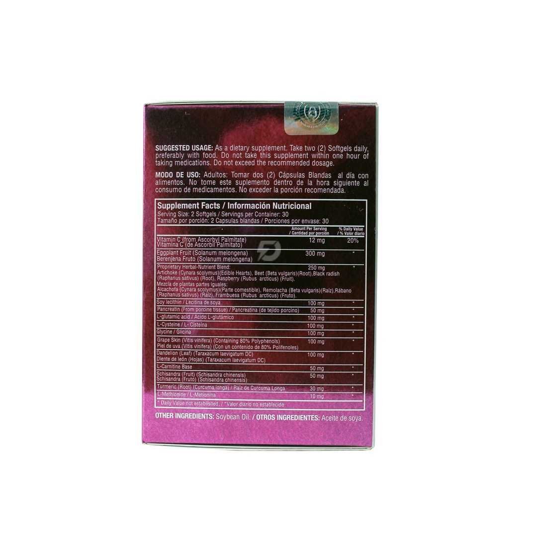 Alcachofa parte comestible de (cynara scolymus), raíz de remolacha (beta vulgaris), raíz de rábano (raphanus sativus), fruto de frambuesa (rubus arcticus) (vegetal), Fruto de berenjena (solanum melongena) (vegetal), Pancreatina de tejido porcino (enzima), Ácido L-Glutámico (aminoácido), L-Cisteína (aminoácido), Glicina (aminoácido), Piel de uva (vitis vinífera, con un contenido de 80% polifenoles) (vegetal), Diente de león (taraxacum laevigatum) hojas (vegetal), L-carnitina base (aminoácido), Schisandra chinensis fruto (vegetal), Raíz de Curcuma Longa (vegetal), L-metionina (aminoácido).